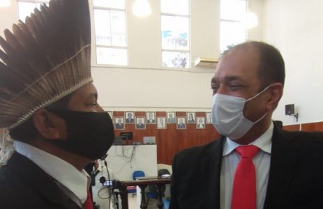 Durante a cerimônia de diplomação o prefeito Marão e o vereador indígena Cláudio Magalhães, tiveram uma breve conversa.Foto: Tiago Pascoal