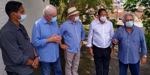 O secretário de comunicação Alcântara Pellegrini, com o senador Otto Alencar, secretário Fábio Vilas-Boas, prefeito Augusto Castro, e o deputado Paulo Magalhães, durante a visita do governador Rui Costa