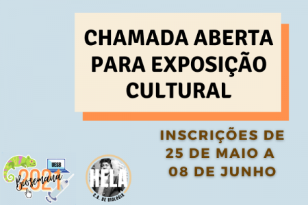 A organização da BioSemana 2021 informa que estão abertas as inscrições para a exposição cultural, que ocorrerá durante o evento. As inscrições já estão abertas e podem ser realizadas até o dia 08 de junho, de forma on-line, por meio de formulário. A Exposição Cultural tem o objetivo de enriquecer a BioSemana com obras pertinentes ao debate sócio-ambiental. :: LEIA MAIS »