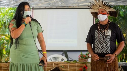 Representante da Educação Escolar Indígena da SEC, Larissa Raiara Cruz, e o professor indígena Cacique Valdenilson Tupinambá. Crédito: Ajayô Filmes