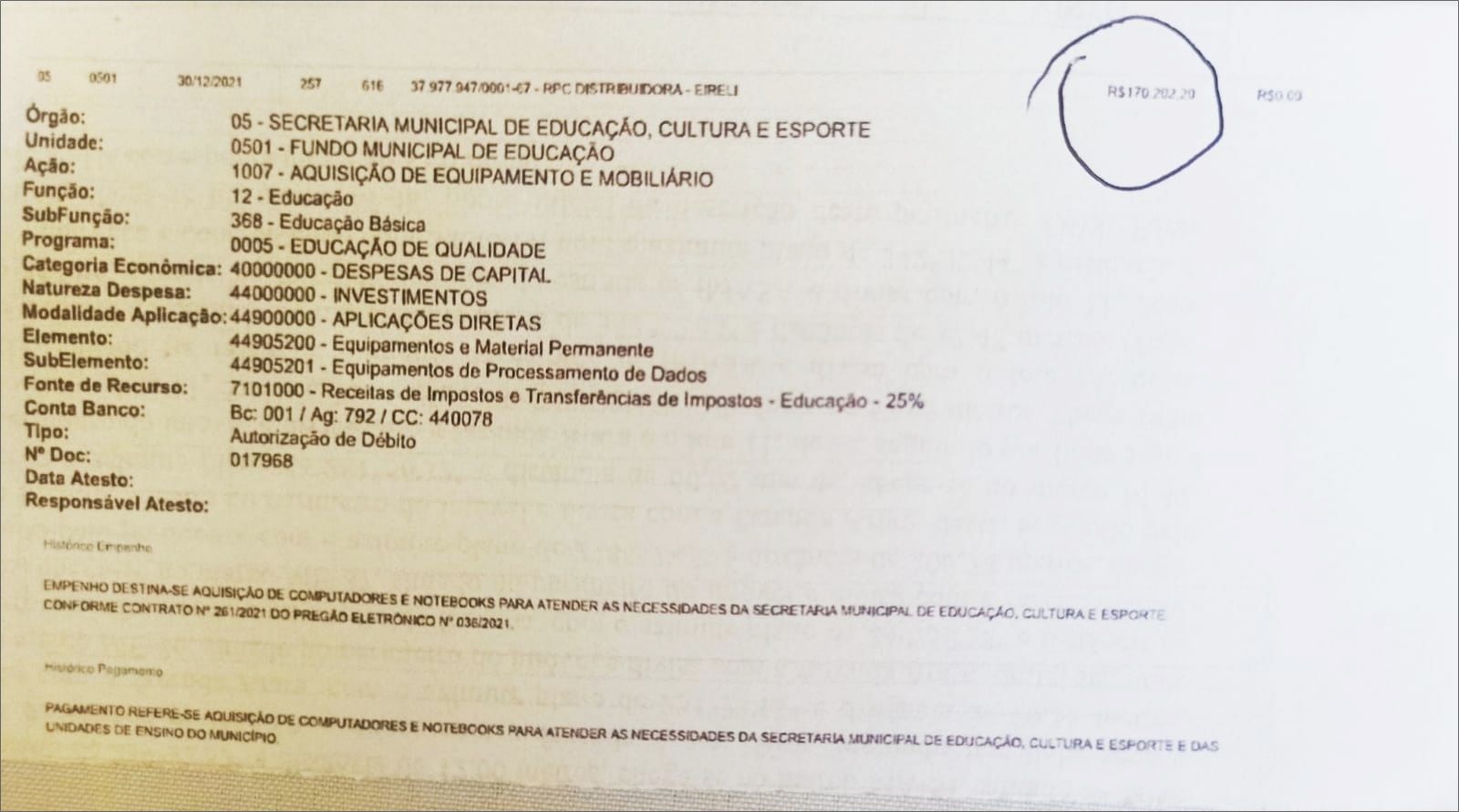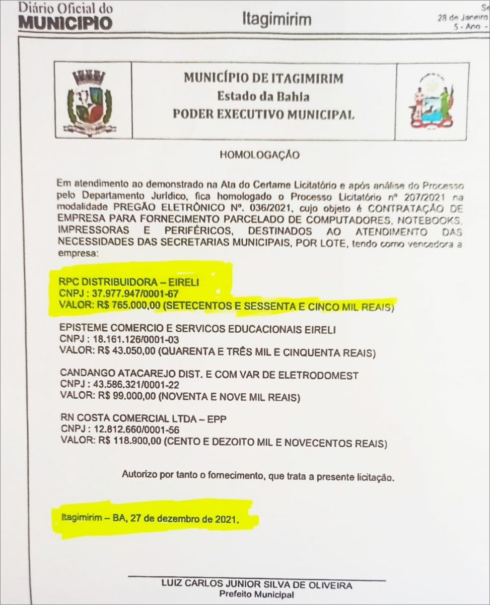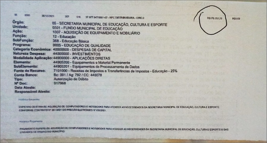 Conforme denúncias protocoladas na Justiça Federal, Ministério Público Estadual, Tribunal de Contas dos Municípios e Polícia Federal, o gestor homologou no dia 27 de dezembro, o Processo Licitatório de número 207/2021, na modalidade Pregão Eletrônico, um contrato com a empresa RPC Distribuidora- Eireli, no valor de R$ 765 mil, para aquisição de computadores, notebooks, impressoras, para as secretarias municipais.