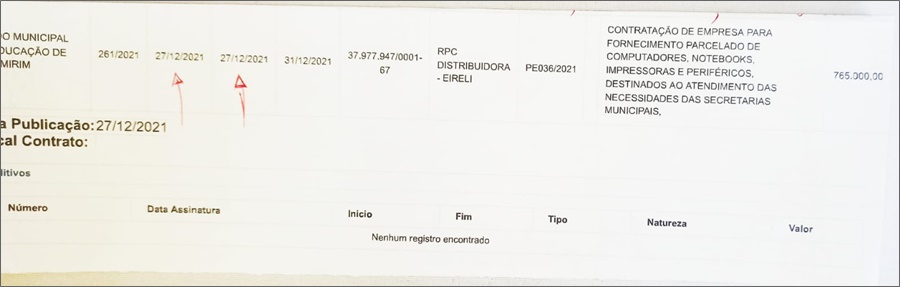 O mais grave neste contrato, no apagar das luzes de 2021, foi publicação no Diário Oficial, anunciando o Pregão Eletrônico para o dia 28 de dezembro às 8:30 horas. Só que no Diário Oficial do Município, no dia 28/12, foi publicado a homologação dos contratos dos vencedores do certame no dia 27/12.
