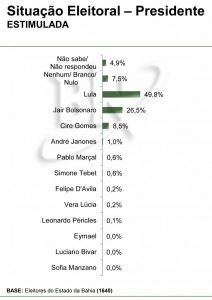 Na Bahia, Lula tem 49,8% dos votos e Bolsonaro 26,5%, diz Paraná Pesquisas/BN