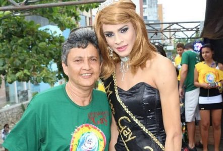 A coordenadora Diala Magalhães, pousa para foto ao lado da Mis Gay , em edições anteriores. Foto: Divulgação.