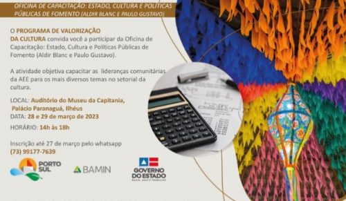 Com o apoio da secretaria municipal de Cultura de Ilhéus, o Programa de Valorização da Cultura da Bamin (Bamin/Isus), convida os interessados para participarem da Oficina de Capacitação: Estado, Cultura e Políticas Públicas de Fomento (leis Aldir Blanc e Paulo Gustavo).