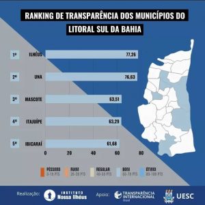 O trabalho avaliou 26 município com a metodologia da Transparência Internacional – Brasil, que tem como objetivo oferecer um índice confiável para que a sociedade, a imprensa e os próprios órgãos de controle tenham acesso à informação e monitorem as ações do Poder Público na promoção da transparência e da participação social e no combate a corrupção. Acesse: www.nossailheus.org.br